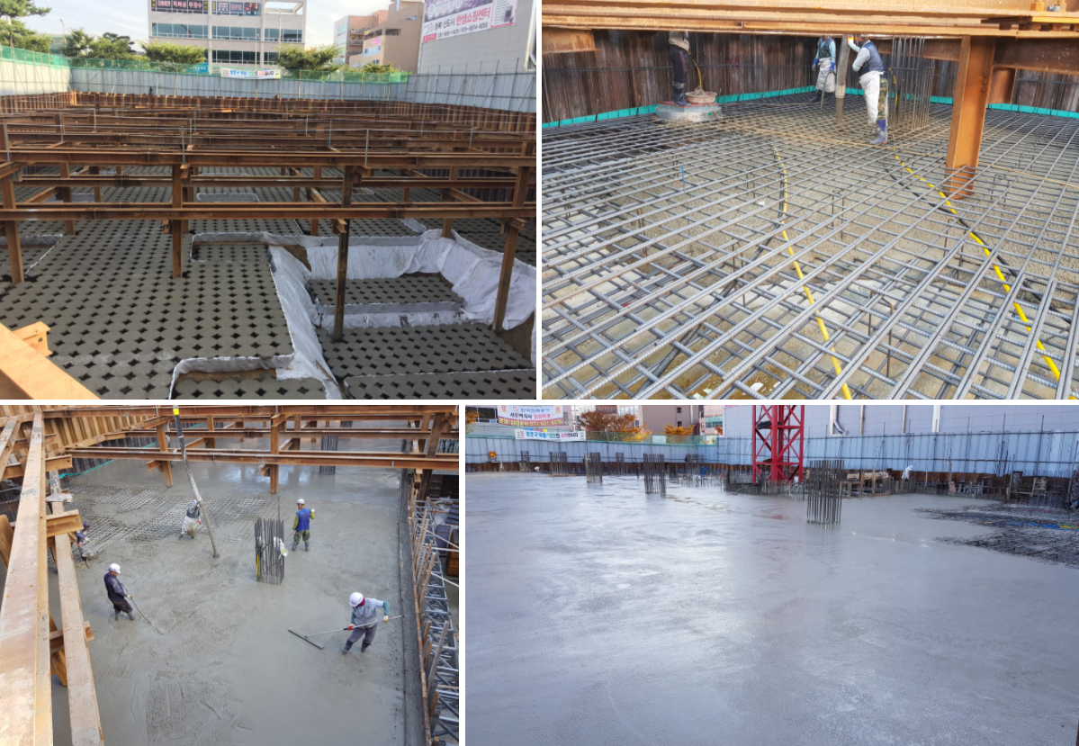 터파기 공사가 완료된 후 지반보강공법인 팽이기초및 기초타설, 지하외벽 타설, 1층 슬라브 타설 순서로 공사가 바쁘게 진행되었습니다.