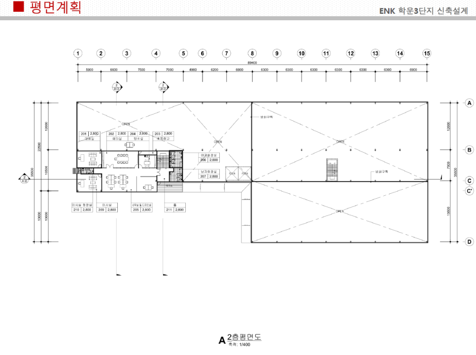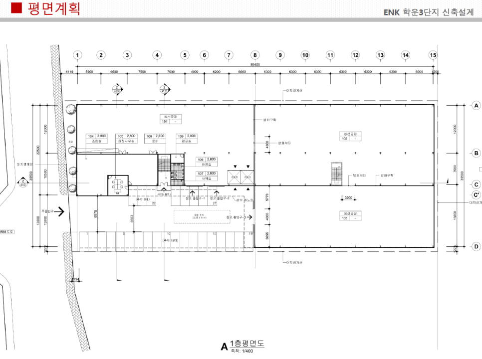 건물의 배치는 장방형의 대지에 최대 건축면적을 확보하는 것으로 시작하였습니다. 거기에 생산(창고), 서비스 공간, 다용도 공간 등을 조닝 하여 전체 평면계획을 협의하였습니다. 공장, 창고 용도이지만 작은 불편함도 비효율로 이어질 수 있기 때문에 근무부서별 담당자와 여러 번의 회의를 하여 기둥 간격, 동선, 프로그램 등을 정하였습니다. 여기에 추후 증축을 고려한 설계를 진행 중이어서 1차 공사에 반영할 사항 등을 빠짐없이 챙겨서 진행 중입니다.