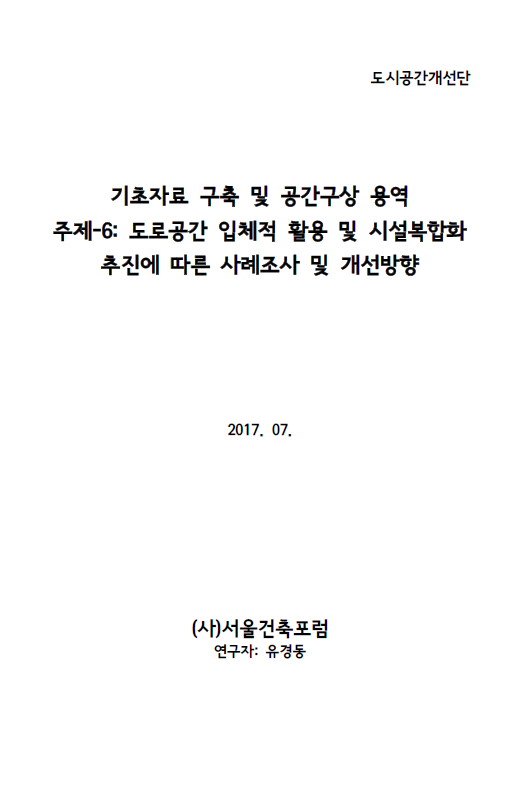 국토교통부에서 추진 중인 도로공간의 입체적 활용 및 시설복합화와 관련된 사례조사 및 간략한 개선방향에 대한 의견을 제시하는 용역을 완료하였습니다. 앞으로 도시에서 적용되고 복합개발 등과 관련하여 건축가들의 많은 아이디어가 필요하기도 하고 또 좋은 의견이 많이 반영되어야 할 것 같습니다.